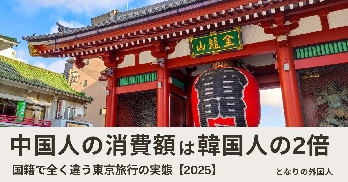 出典:令和6年 国・地域別外国人旅行者行動特性調査(東京都産業労働局)、2025年 東京都観光客数等実態調査 Q1〜Q3(東京都産業労働局)、訪日外国人消費動向調査 2025年暦年速報(観光庁)をもとに『となりの外国人』編集部が作成。