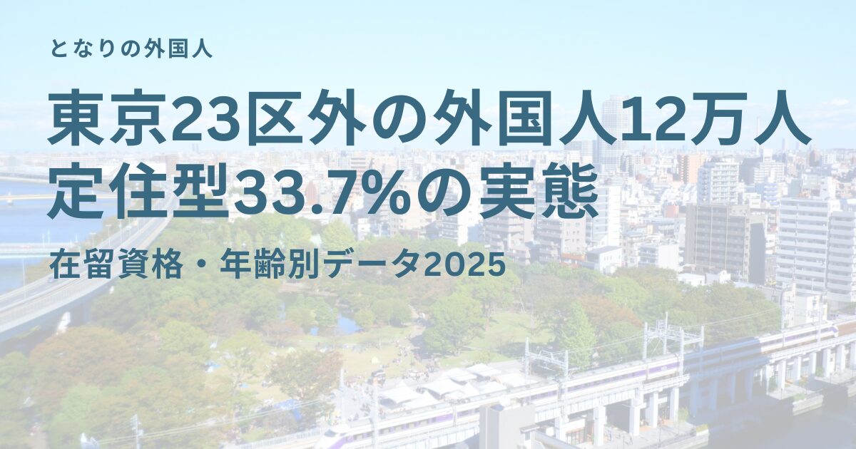 東京23区外(多摩地区・島嶼部)の在留外国人124,885人は、永住者27.9%・定住型33.7%という定住コミュニティの厚さが最大の特徴です。23区(定住型28.5%)より定住型の比率が高く、技能実習も5.3%と23区(1.7%)より高いなど、都心部とは異なる外国人コミュニティの構造があります。